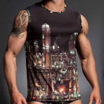 Bruno Banani Pipeline Tank Top. The smooth fabric of the Pipeline Tanktop is covered with an almost photographic print of a power plant, including various towers, tanks and pipes in hues of grey, green and orange all set against a black and grey striped backdrop.